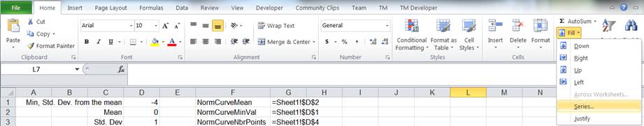 =NormCurveMean+NormCurveStdDev*(NormCurveMinVal+ABS(2*NormCurveMinVal)/(NormCurveNbrPoints-1)*(ROW(OFFSET(Sheet1!$A$1,0,0,NormCurveNbrPoints,1))-1)) |
