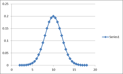 The ability to carry out this transformation is very important since we can do all our analysis with the standard normal distribution and then apply the results to every other normal distribution, including the one of interest. For example, to draw a normal curve with a mean of 10 and a standard deviation of 2 (m=10, s=2), draw the standard normal distribution and just re-label the axis. The first figure below is the standard normal curve and the next figure is the curve with (m=10, s=2).