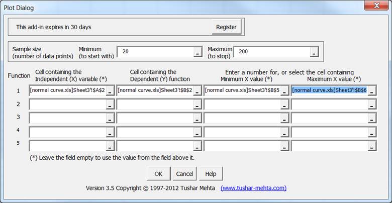 The first three cells contain information similar to that provided in the Enumerate a set of points in a worksheet. The last item is analogous to the step value used in the Fill dialog box. However, this time, the number of points used in the chart is specified directly.