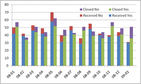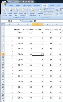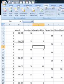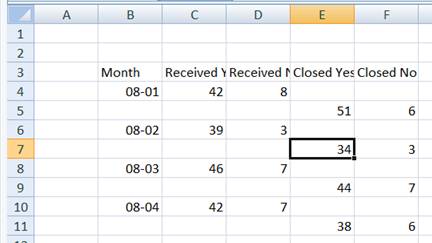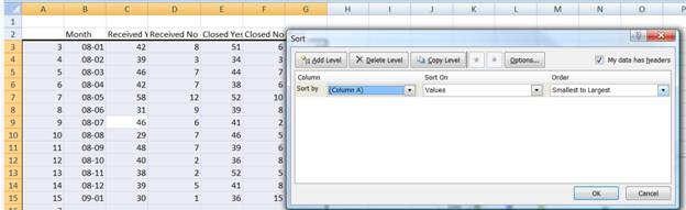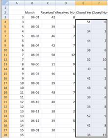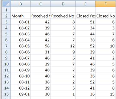 Clear the contents of column A since they are no longer required. Select the data range and create the stacked column chart. It might help to temporarily delete the 'Month' literal from cell B2 (Excel will then treat the 1st column as the x values). Again, remember to (1) set the type of the x-axis to Text (or Category in Excel 2003 or earlier), and (2) change the Gap Width to 0.