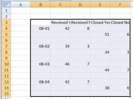 We are almost done. All that's left is the empty row after each data pair. Remember the values copied to A29:A41? They will now come into play. Select A4:F41 and sort on column A ascending. The result will be the data laid out as we want them. A partial snapshot: