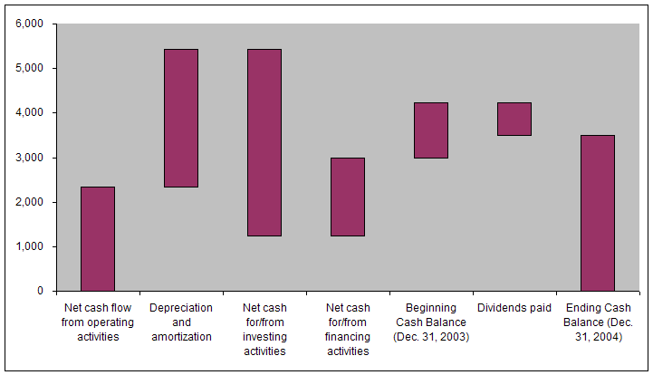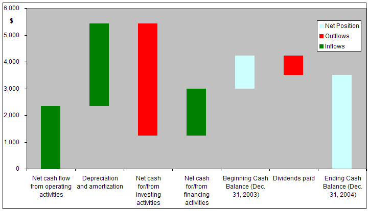 A typical waterfall chart is shown in Figure 1. A somewhat modified version of the chart, leveraging Excel's capabilities to enhance the visual display of the chart, is shown in Figure 2. This tutorial explains how to create the latter chart. The example demonstrates one hypothetical financial statement of an organization -- the Cash Flow Statement for the year 2004 illustrated in Table 1.
