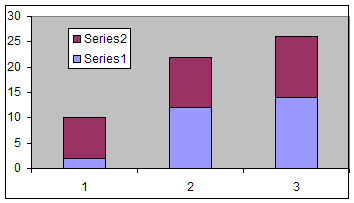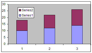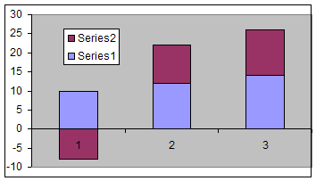 Typically, a stacked chart shows two series so that one series is plotted "as is" and the 2nd series is stacked on top of the first. Consider the example data in Table 2. The first data point of series 1 is 10 and the corresponding data point of the 2nd series is 8. So, Excel will show the first series as a bar from zero to 10, and the 2nd series as a bar from 10 to 18 (see Figure 3).