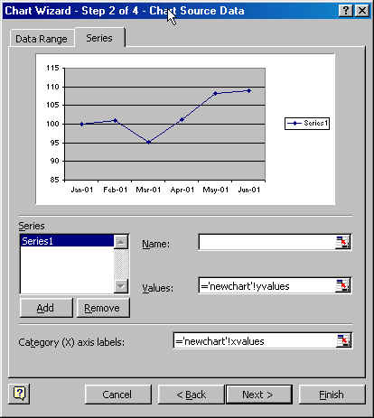 Select an appropriate chart type. For this example, use the Line Chart. Click 'Next' and move to the Step 2. Click on the Series tab. Click the 'Add' button and fill in the names for the two series. |
