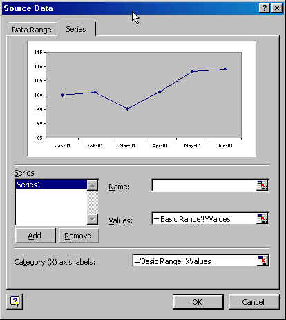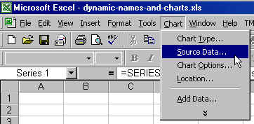 After creating the named formulas, there are a few different ways to use them in a chart. For the examples in this page, we will use worksheet-level names as shown on the named formula page.
