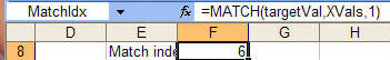 This is the index into the XVals range that corresponds to the x0 value. The index for the x1 value, will be one greater than MatchIdx. The actual x0 value is given by INDEX(XVals, MatchIdx) and the x1 value by INDEX(XVals, MatchIdx+1)