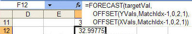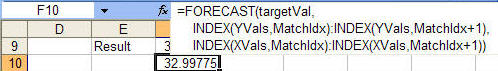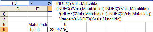 There are instances when a VBA function might be easier to use than worksheet formulas. One instance would be error handling. The above solutions work just fine as long as the target X value is well behaved. Enter a value larger than the largest value in the X range and the result will be #REF! or #DIV/0! Yes, one could expand the formula to trap errors but that would make the formula unwieldy.