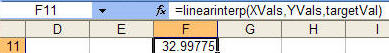 It is possible to simplify the analysis with other built-in Excel functions. The FORECAST function is normally used for interpolation with an entire data set. However, if its arguments are only two data points, its result will be the same as a piecewise linear interpolation.