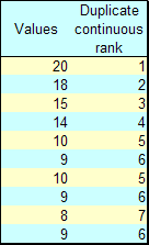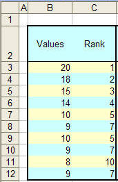 continuous ranks, i.e., no breaks in the rank. In the first cell containing a rank, enter the array formula1 =SUM(1/(IF(RankRng<C3,COUNTIF(RankRng,RankRng),9.999999999E+307)))+1 Copy as far down as there are data in DataRng.