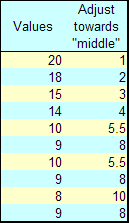 "middle" value. In the first cell containing the rank, enter the formula =RANK(B3,DataRng)+(COUNTIF(DataRng,B3)-1)/2 Copy as far down as there are data in DataRng Note that the Excel help file recommends the more complex correction factor =(COUNT(ref) + 1 � RANK(number, ref, 0) � RANK(number, ref, 1))/2