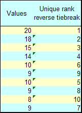 assigns ranks in reverse order In the first cell containing a rank, enter the formula =RANK(B3,DataRng)+COUNTIF(DataRng,B3)-COUNTIF($B$3:B3,B3) Copy as far down as there are data in DataRng. |