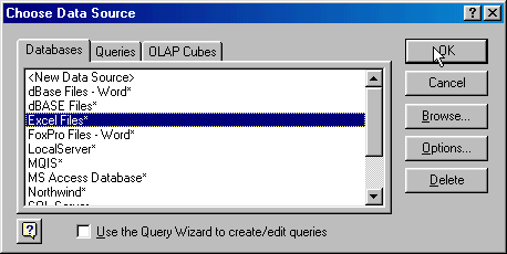 At this point MS Query will display a dialog box asking for the workbook containing the data. Find it on the hard disk and select it.