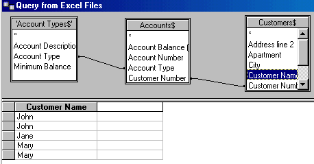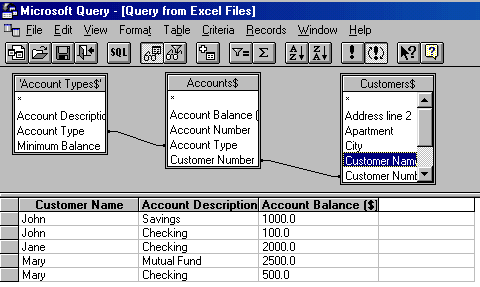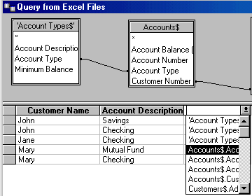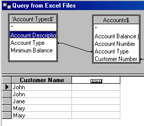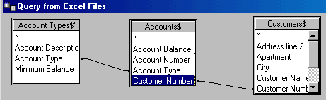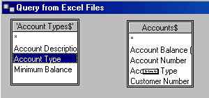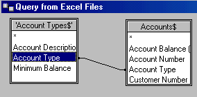 To tell MS Query how the tables are related to each other, click on the common field in the first table and drag the mouse over to the corresponding field in the second table. For example, to link the Account Types and the Accounts tables, click on the Account Type field and drag the mouse over to the Account Type field in the Accounts table. Note that the mouse becomes rectangular when it is positioned within the second table.