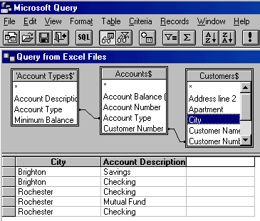 Now that we know how to link to MS Query, how to add tables to a query within MS Query, how to add fields to the query, and how to return data to Excel, we can expedite building this query. Once in MS Query add all three tables to the query, link them, and add the City and Account Description fields to the query result.