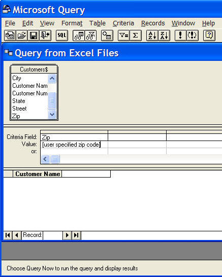 Now that we know how to link to MS Query, how to add tables to a query within MS Query, how to add fields to the query, and how to return data to Excel, we can expedite building this query. Once in MS Query add the Customers table to the query. Then, use View | Criteria to see the Criteria pane. This works very similar to where we select the fields to display. In the Value row, one can either enter a specific value or defer the decision to the time when the query is executed. To do the latter, enclose the text in square brackets as shown below, making sure to not use the name of an actual field.