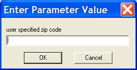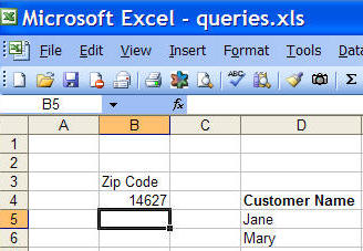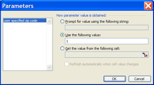 Select File | Return data to Microsoft Office Excel to return to Excel. MS Query will try and run the query and since it needs to know what zip code to use, it will pop up with a dialog box like: