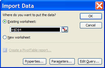 Back in Excel, note that the dialog box does not offer a choice to Create a PivotTable report... This is because PivotTables do not support parameterized data sources.