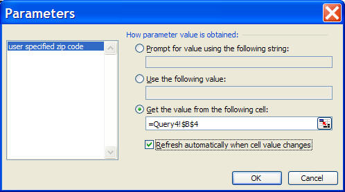 This is where we get to see the real power of a parameterized MS Query. Select the last option Get the value from the following cell. This enables the field to specify the cell and the checkbox Refresh automatically when cell value changes. As the name implies, the query will be rerun whenever the parameter value in the specified cell changes.