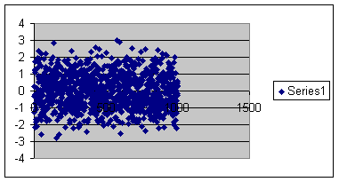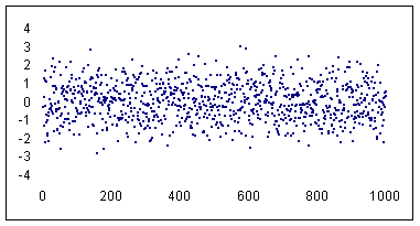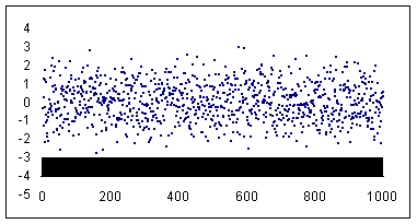 Step 2: Set the series marker to a minus sign (i.e., '-') with a size of 2 units. Remove any extraneous formatting (legends, gridlines, borders, plot area, etc.) that Excel creates by default. Adjust the min and max values of the x- and y- axis to your satisfaction (I used -4 to +4 for the y-axis and 0 to 1000 for the x-axis). Remove the solid line used for drawing the axis. Also, change the y-axis attribute so that the x-axis crosses at a value of -4 -- which is -4 sigma. I also changed the font size of the axes to 9 point and turned off the auto scale option.