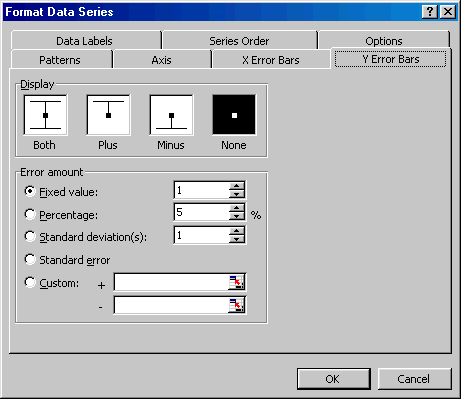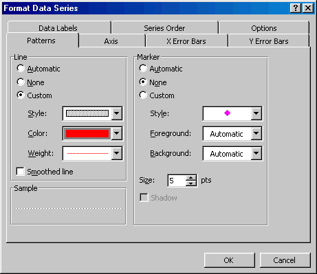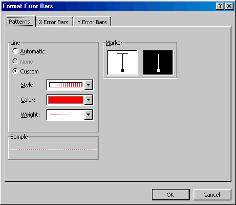 Step 6: Double-click the (error) bars to format them. In the Patterns tab, set the line style, color, and weight as for the series itself (see the previous paragraph). In addition, select the Marker type to be the vertical type without the horizontal cross line (it's the second option in the Marker section of the Pattern tab).
