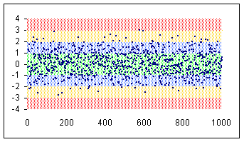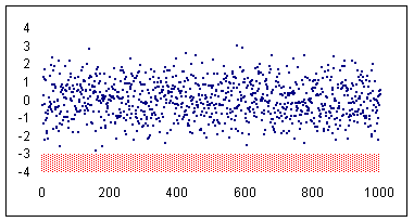 The data set: Start with a thousand normally distributed random numbers with a mean of zero and a standard deviation of 1. This means the data set would have about 2/3 of the points in the range -1 to +1, 95% in the range -2 to +2 and 99.5% in -3 to +3. The remaining, or about 5 points would be either < -3 or > +3.