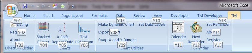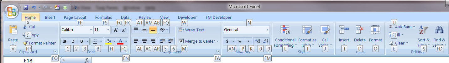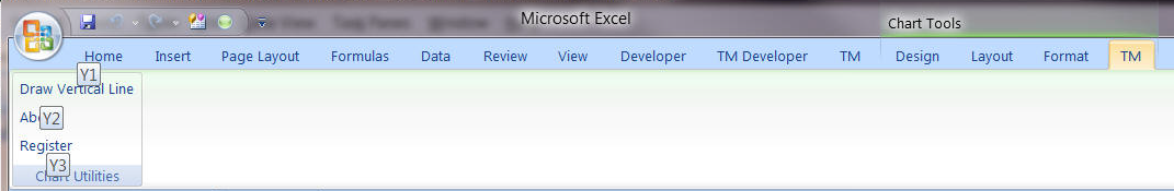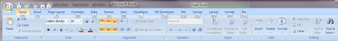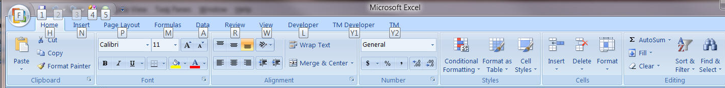 In addition, in Excel 2007 - and in other Office 2007 applications that support the new Ribbon, every ribbon item has an automatic keyboard "shortcut." Press the ALT key to display the 'top level' keystrokes to select a specific Ribbon tab or a Quick Access button. Note that this keyboard combination extends to any customization of the ribbon. In the example below, one can access TM Developer and TM through the ALT Y 1 and ALT Y 2 combinations, respectively.