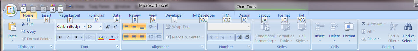 The rest of the steps in working with the contextual tabs and the custom contextual tabs are similar to those explained above. For example, to select the Chart Tools | TM contextual tab follow up the ALT with Y 0 3 to get