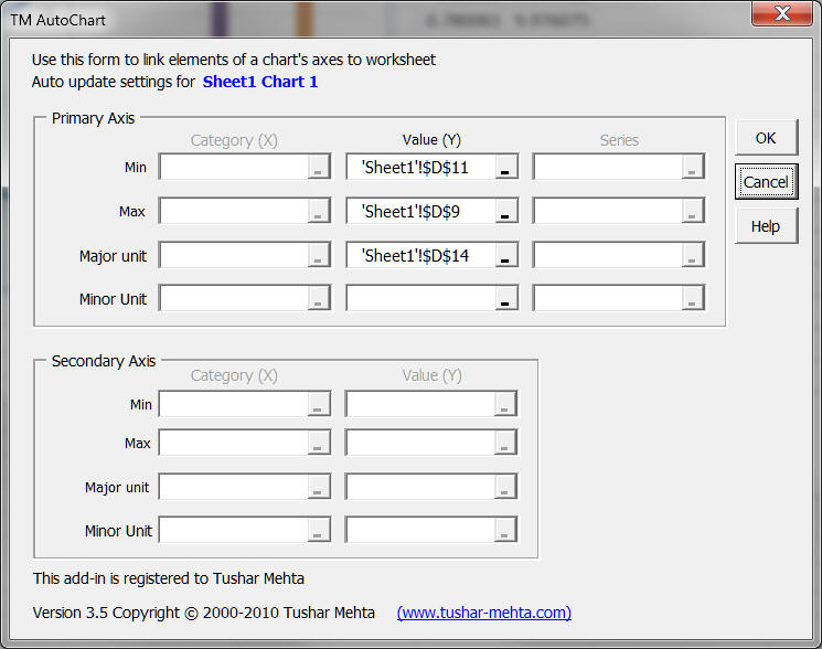 The add-in figures out for itself what kind of chart it is dealing with. It uses this information to selectively enable only those fields that correspond to axes that can contain customizable parameters. For example, only if the chart has a secondary axis that can contain numeric parameter values such as minimum, maximum, and major and minor ranges will the corresponding dialog box fields be enabled.