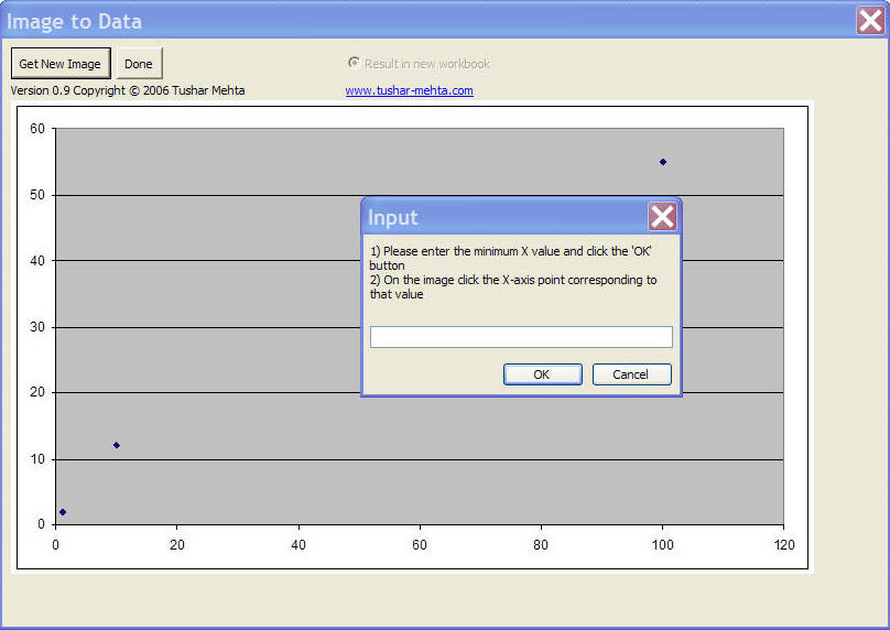 Click the Get New Image button to load a new image of a chart. This will also trigger a calibration process. This will help the add-in track how the various points on the image map on to the actual values of interest. This four step process separately identifies each of the X-minimum, X-maximum, Y-minimum, and Y-maximum values. The image below shows the first point to be calibrated. In the first of four steps, enter the minimum x value (zero in this case) and after the Input dialog box closes click on the x-axis location that corresponds to this value. The next 3 steps in the calibration process identify the other three critical locations.