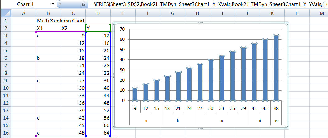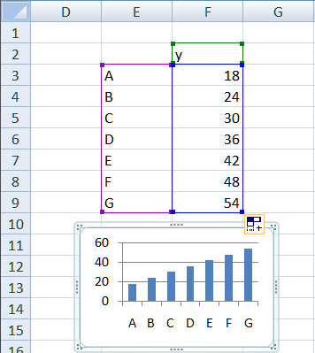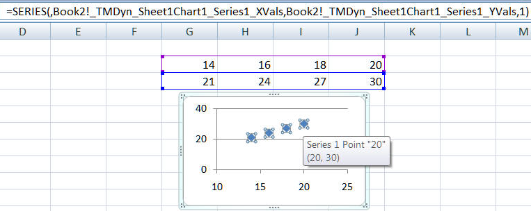 This feature converts a regular chart into a dynamic chart, i.e., one that automatically plots new data added to the plotted range. The code adjusts to data in columns or in rows and it also factors in any header cells in the data column (or row). It also works when the X values include multiple columns.