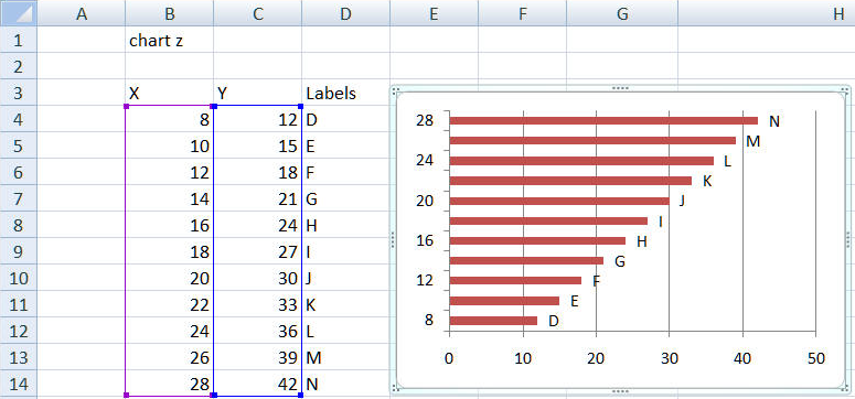 Similarly, if we look at the data set below, the Y range is larger than the X values by a factor of 2.86 . Yet, the physical size of the chart shows a larger x range!