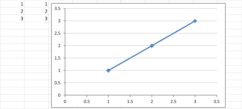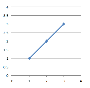 When Excel creates a chart, the physical size of the chart is independent of the values of the data plotted. So, even if one were to plot identical x and y values, as on the left below, the visual effect fails to convey the information that we are plotting a line that should be at 45 degrees to the horizontal. While both the axes show the same range of values, the horizontal dimension is much longer than the vertical one. To get the correct visual effect, as on the right below, the horizontal and vertical sizes should be the same.