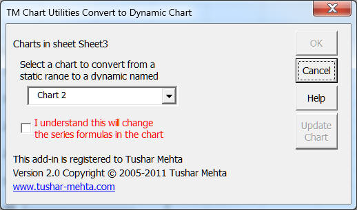 Click the Make Dynamic Chart button to bring up the corresponding dialog box. If a chart is already selected, it will show up in the chart selection drop down. Use the drop down to select the chart to be made dynamic.