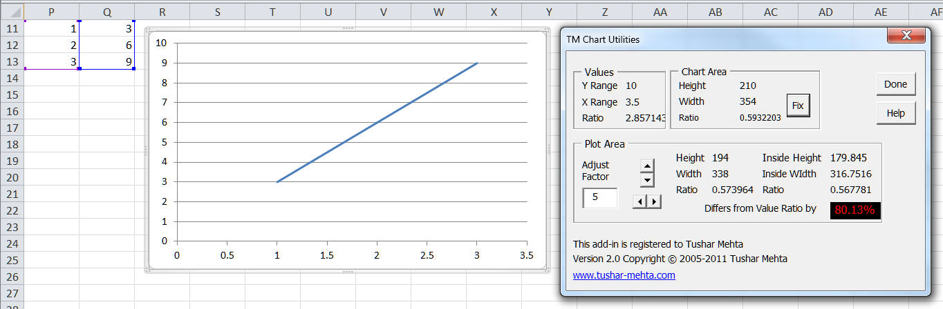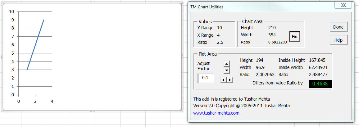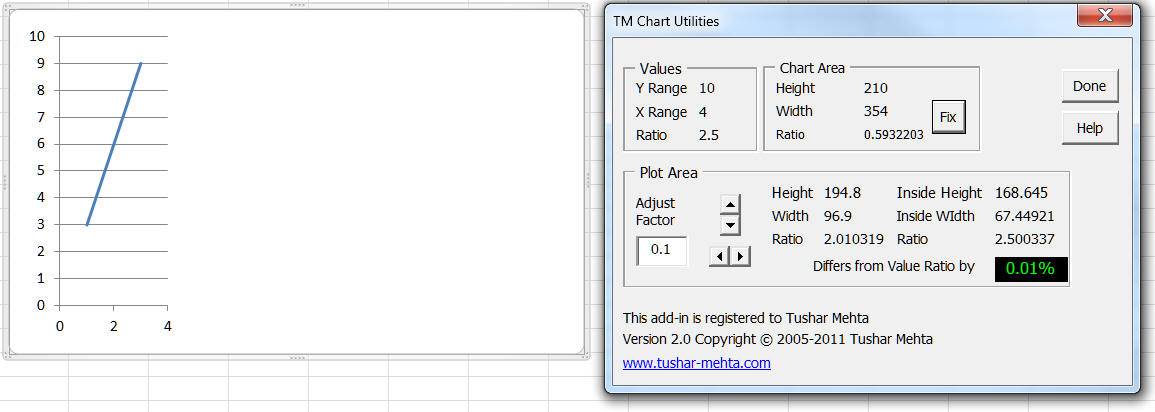 To start the process of making the physical size match the values shown, start by clicking the . The resulting dialog box, shown on the right in the image below, shows that the ratio of the values is 2.857 (rounded to 3 decimal places) whereas the ratio of the inside plotarea dimensions is 0.568. The difference between the two is a whopping 80%!