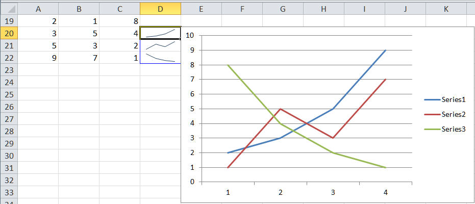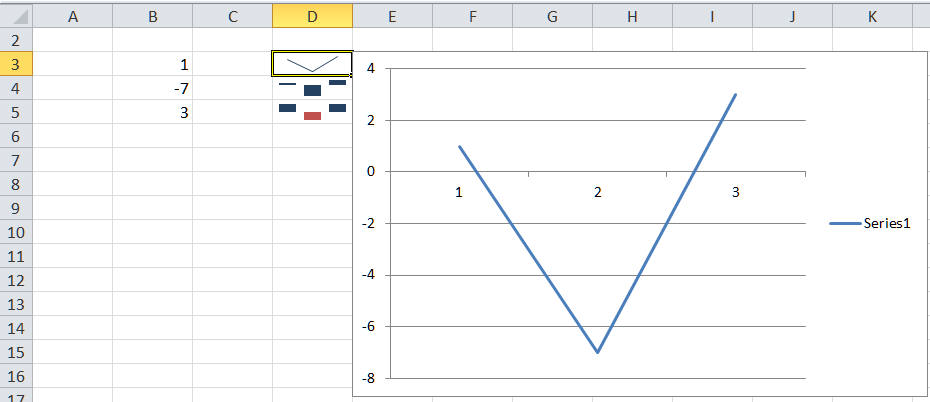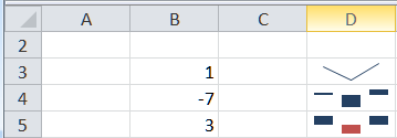Below is an example. It plots the same data set in three sparklines (D3:D5). Select any of those cells to see the data in a regular chart using the same kind of plot. [For a Win/Loss Sparkline, the regular chart type is a Column Chart.]