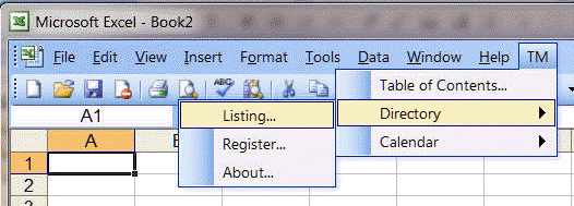 In Excel 2003, select TM|Directory ► Listing... to bring up the Directory Listing dialog box.