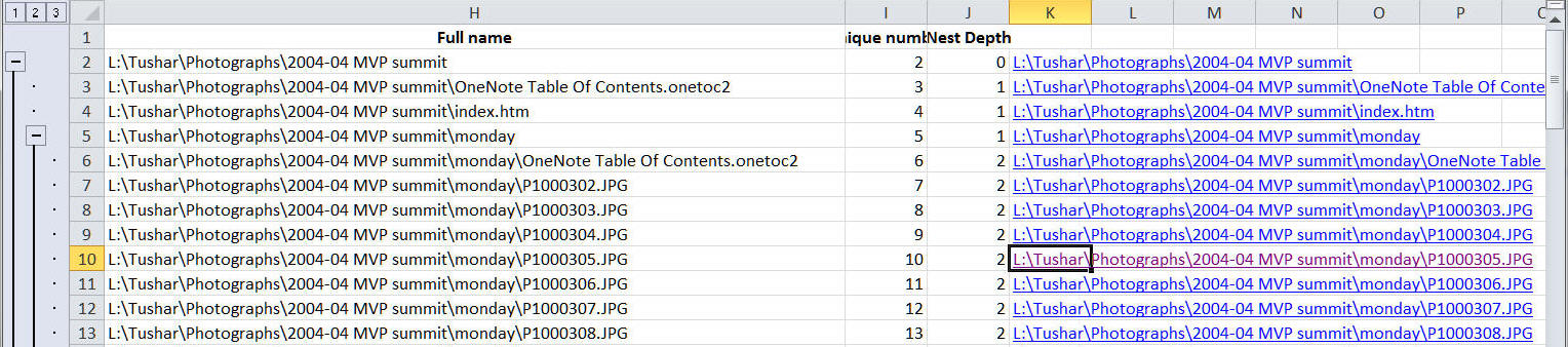 2) Outline Grouping. This lets one collapse or expand sub-trees within the directory listing. Once the add-in completes use Excel's menus / tabs to control the outline.