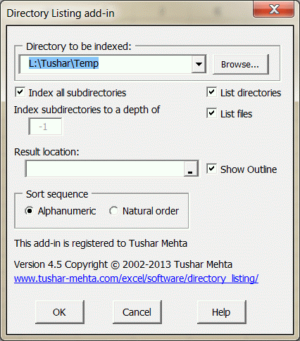 In Excel 2007 or later, select the TM tab | Utilities group | DIrectory Listing button to bring up the Directory Listing dialog box.