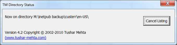 While the add-in is working, it shows the directory it is currently processing in a dialog box. In addition, the dialog box also contains a Cancel Listing button. Click this button to have the add-in stop when it finishes the current directory.