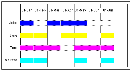 The following simplified example demonstrates a Gantt chart as one might it in a project. Consider four people working on a project with busy times as shown below. John is busy in the period ending Jan 1, idle during the period ending Feb 1, busy from Mar 1 to May 1, etc.
