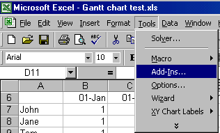 To create a Gantt chart, lay out the project data so that it forms a table as shown in Figure 1. Ensure that there is at least one empty row and one empty column to each side of the data. Select any cell within the table and select the Gantt (Project) Chart... menu item.