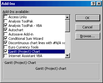 Click the Browse... button (see Figure 4), and locate and open the GanttChart.xla file saved in the previous step. Ensure that the checkbox next to the Gantt (Project) Chart entry is checked.