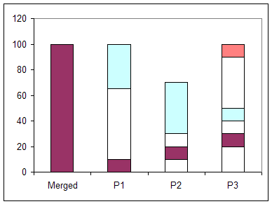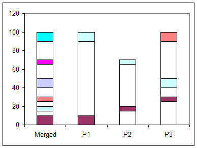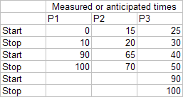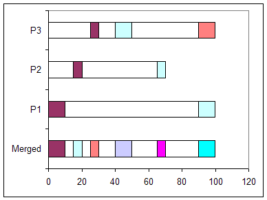 In the Example 1a, the start-stop information for P1, P2, and P3 contain no overlap except in the 90-100 region and the merged "start-stop" list reflects that. If the data represented when P1, P2, and P3 were "on" (in a call center or on guard duty or on station in a control room), the merged result provides information when at least one person was "on." In this example, having all three on at the same time still leaves several gaps in coverage.