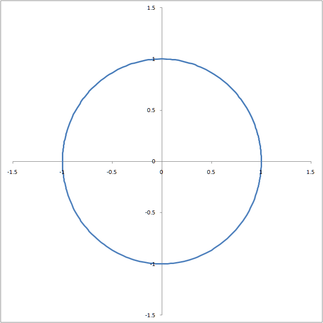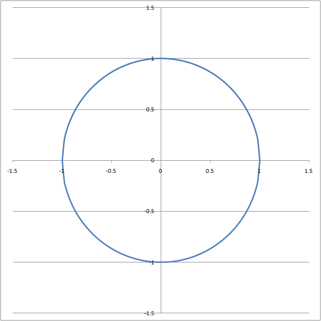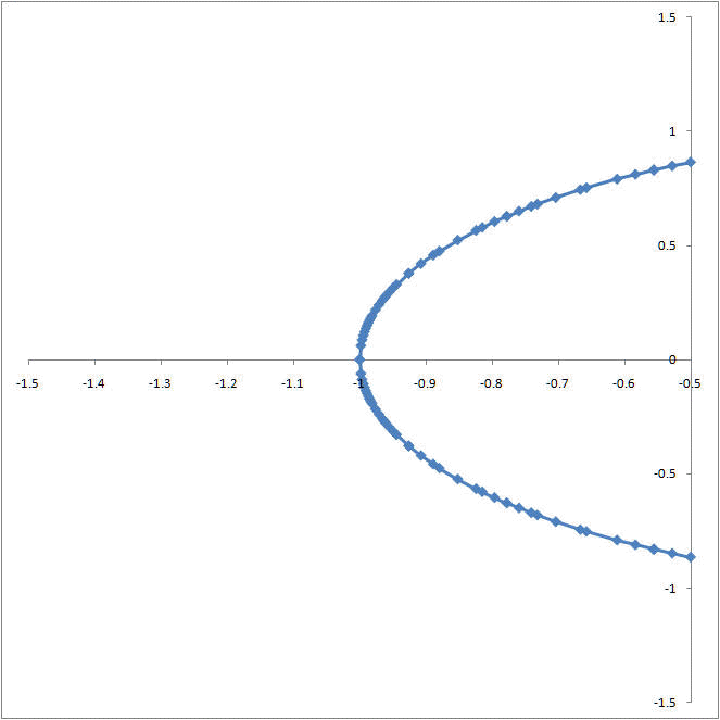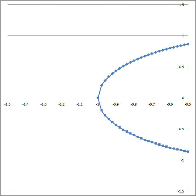 The software draws smoother curves by concentrating its efforts on those portions of the graph with a greater curvature. The importance of this uneven distribution of data points is best illustrated through an example. Consider the circle drawn in Figures 6 and 7. In Figure 6 (drawn with TM Plot Manager) the line is smooth at x = -1 and x = +1. By contrast, in Figure 7 (drawn with equidistant points in an Excel worksheet) the lines at x = -1 and x = +1 meet at an angle! One can see the effect in more detail by zooming in on the x range of -1.5 ≤ x ≤ -0.5 as in Figure 8 and Figure 9.