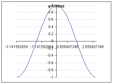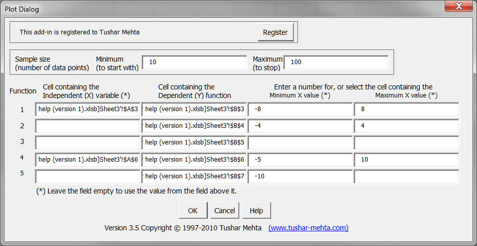 These two dialog box entries specify the domain over which the graph is to be drawn. For example, in the graph shown in the introduction the minimum value would be 0 and the maximum would be 10. Each of these dialog box entries can be either a number or a reference to a single cell, which would contain a number.