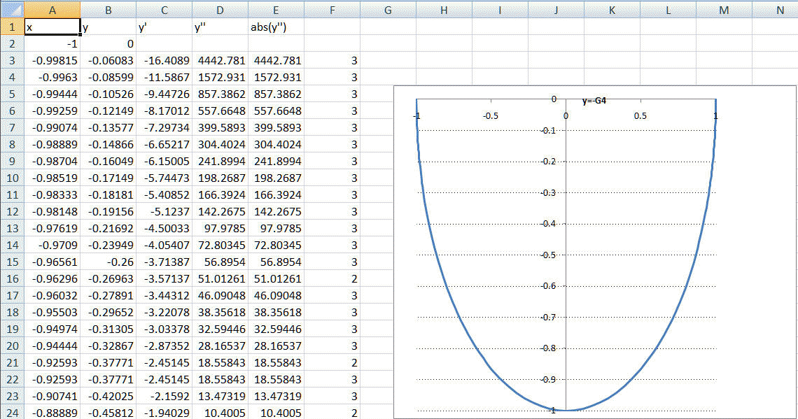 For each specified function the software adds a new worksheet. In this sheet, it computes the X and Y values (in columns A and B) as well as various additional information in columns C:F. In addition, the plot conforming to this function is in a chart embedded in the worksheet.