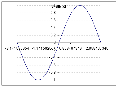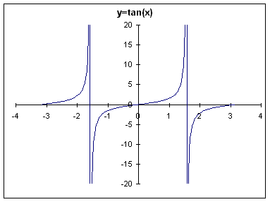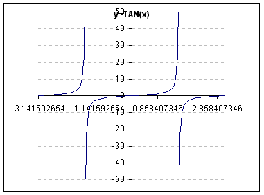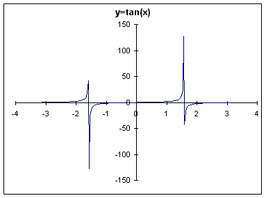 The function y = Tan(x) is another demonstration of how the Plot Manager software does a better job of graphing functions than more common methods. In this case, the function has two asymptotes, at x = -p/2 and at x = p/2 respectively. Note that the x values correspond to x = -90° and x = 90°. The results with the Plot Manager and with an Excel data table are shown below.