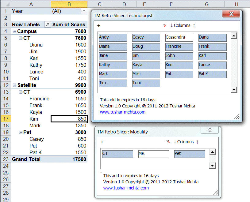 A PivotTable can have multiple slicers filtering data in it. Also, the slicer object is customizable in terms of the number of columns used to show the item values. For example, Figure 2 shows the PivotTable filtered to show data for all technologists other than Cassandra and to show data only for CT and Pet scans.