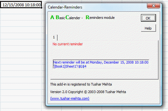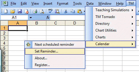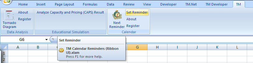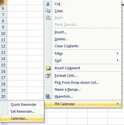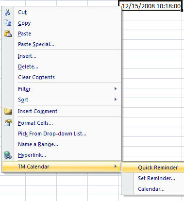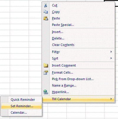 Alternatively, use the ribbon/menu system. In Excel 2007 select from the ribbon the TM tab | Calendar group | Set Reminder button.