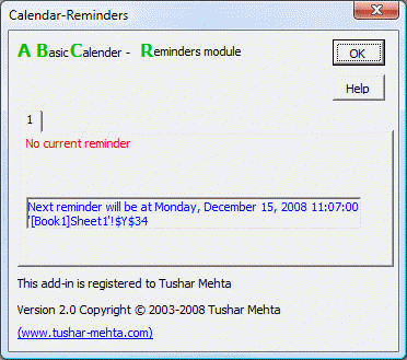 At the time of the next reminder, the add-in will show a dialog box with the current reminder. If another reminder becomes due while the dialog box is still open, the add-in will add another tab with the new reminder.